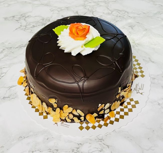 Vår pärontårta är en len och fräsch skapelse där saftiga päron möter en mjuk, krämig fyllning på en perfekt balanserad botten. Tårtan kläs med marsipan och stryks sedan elegant med mörk choklad. Dekoreras med marsipanros och rostad mandel. En stilren och smakfull tårta som passar lika bra till fest som till vardagslyx.